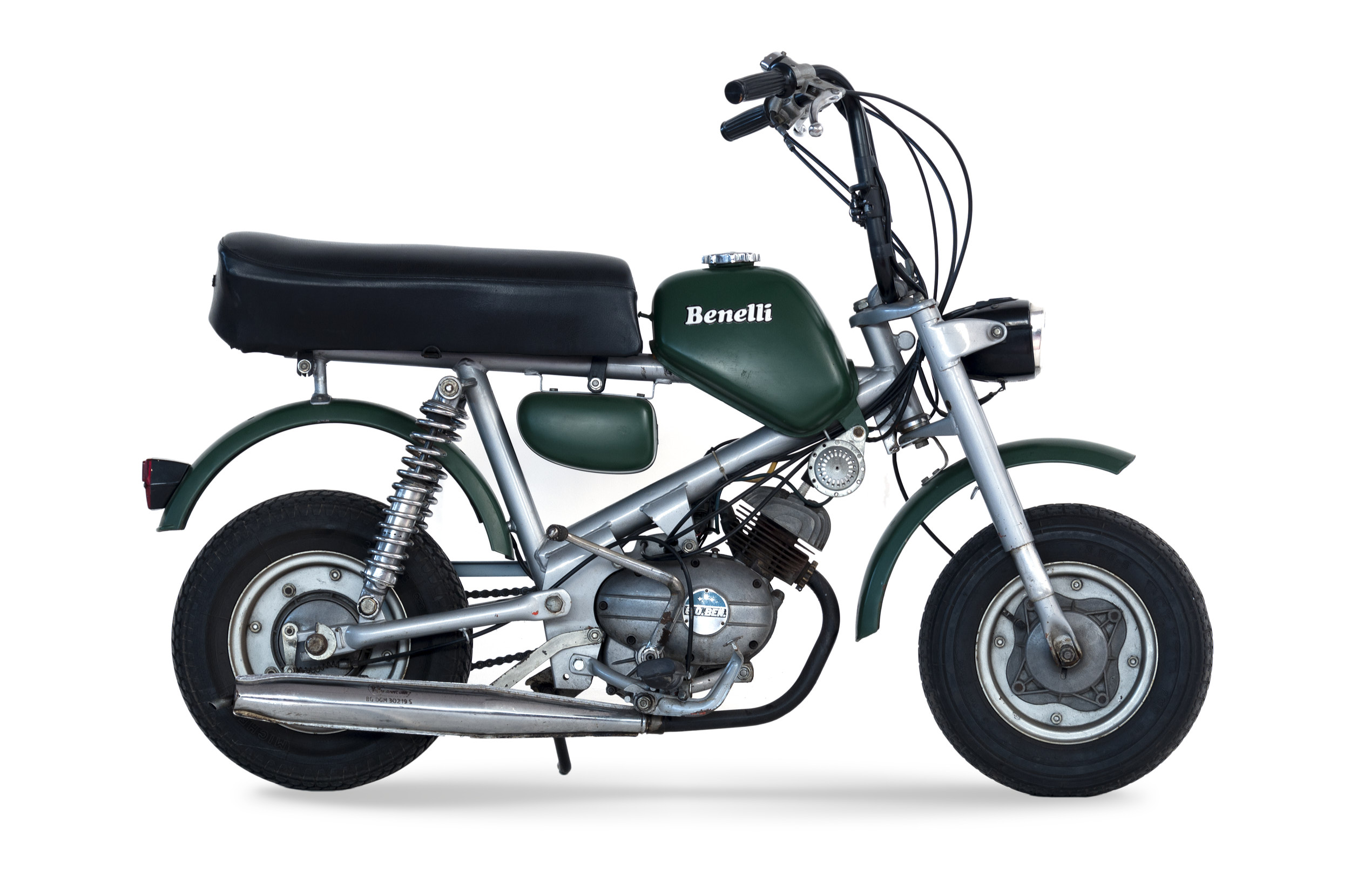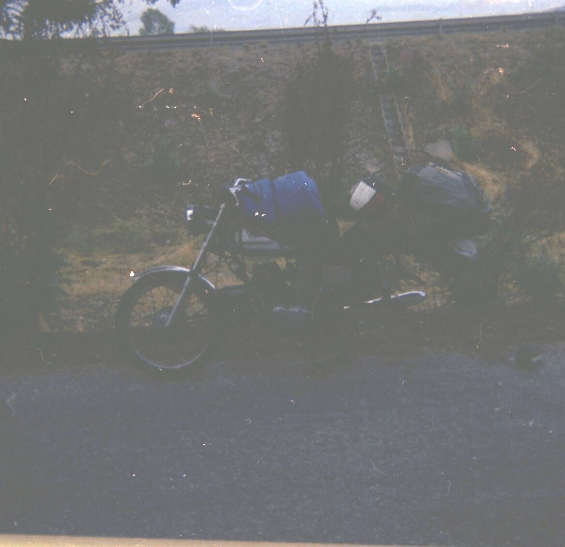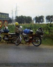 a 2 tempi con ruote da 10" e serbatoio da 3,5 lt: davvero MINI!. Dovevamo viaggiare in due, cosa proibita per un cinquantino, ma il problema lo ignorammo, consapevoli che in vista di una pattuglia della Polizia dovevamo attuare 'un piano d'emergenza'. Il bagaglio fu sistemato così come consentiva il Minibike, il resto sulle mie spalle a mò di zaino. Convincemmo ad aggregarsi, non senza fatica, il nostro amico Luciano che aveva una Moto Guzzi, anche questa di 50 cc