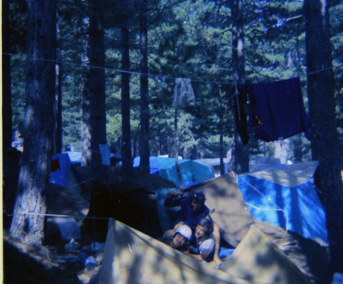 che era uno spettacolo! (Questa volta non potemmo contare sulla confortevole tenda Moretti di Dario e così dovemmo ripiegare su due tende canadesi comprate al mercato americano che, secondo me, avevano fatto veramente la guerra del Vietnam: erano senza fondo e il telo, dal colore tipico militare, era tenuto su da due canne di bambù.)